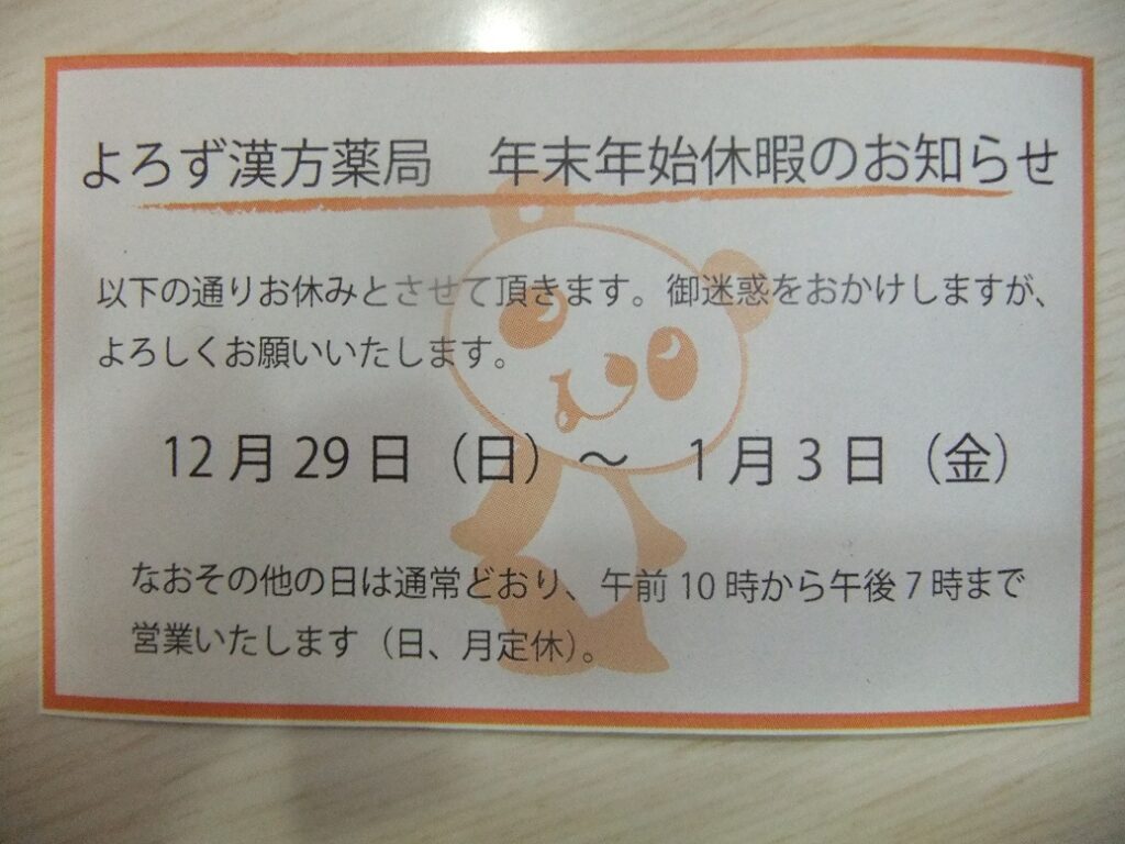 12月28日(土)が年内最終営業日となりますので、どうぞご承知おきください。