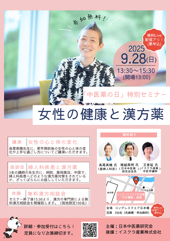 いよいよ、明日9/28(日)の開催となりました、中医薬の日特別セミナー「女性の健康と漢方」。